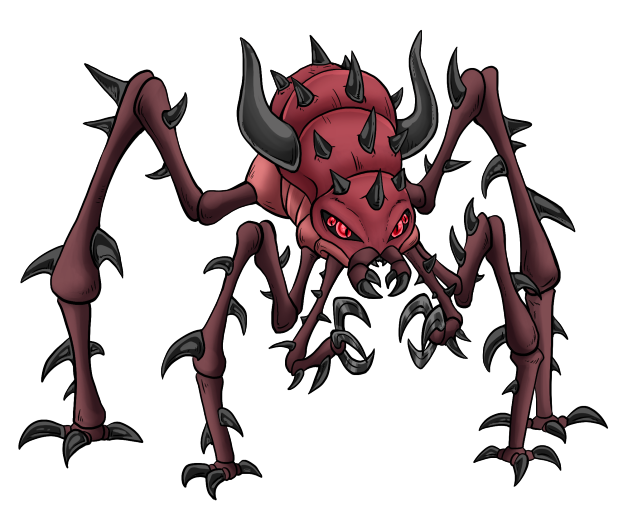 This massive, shambling arachnoid monstrosity is protected by a thick exoskeleton and an array of sharp spines. In combat it will quickly scurry and leap about, firing pyrokinetic rays from all four eyes in rapid succession. Feral specimens can be found lurking in caves, storm drains, abandoned subway tunnels and other dark, damp places during the day. If suddenly roused from its slumber, it will fart out a noxious cloud of corrosive chemicals and beat a hasty retreat.