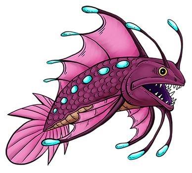 A Kreature created for deep-sea ambush attacks. It can use bioluminescence to produce blinding flashes of light to disorient prey or pulse laser attacks projected from the tips of its barbels; its eyes have nictitating membranes that prevent it from blinding itself. Able to go for months at a time without eating, it gorges itself when given the opportunity. With its stretchy gastrointestinal tract, it is able to consume victims twice its own size. Its flesh reeks of ammonia, making it unfit for human consumption.
