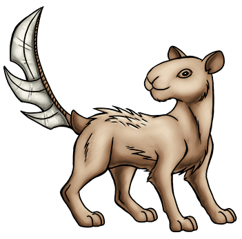 Kagaldie is the meta-form of Jagaldie. Its reflective tail blade can absorb an opponent's energy attacks to replenish its strength or heal its injuries. In addition, its tail is composed of interlocking segments that allow it to catch and control an opponent's appendages. It lives with herds of Jagaldie and appoints itself as their guardian. It takes its job very seriously, to the point where it will even bury their droppings to avoid attracting predators. It will show this same steadfast loyalty towards its tamer.