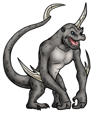 This Kreature is the meta-form of Gogon. It's still a good climber, but at this stage in its life cycle it becomes an herbivore and lives a solitary existence on the ground. It has grown blades all over its body, each of which has its own use. The blade on its head is for chopping foliage as it explores the jungle or constructs a new nest to sleep in each night. The blades on its elbows are for display. The blade on its tail functions as a grappling hook as it climbs. In a pinch, all of them can be used as weapons.
