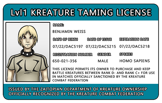 In site update news, profiles for Kraaspine and Soleilian have been added to the Kreature Archive. Also, here’s a legible version of Ben’s license.
