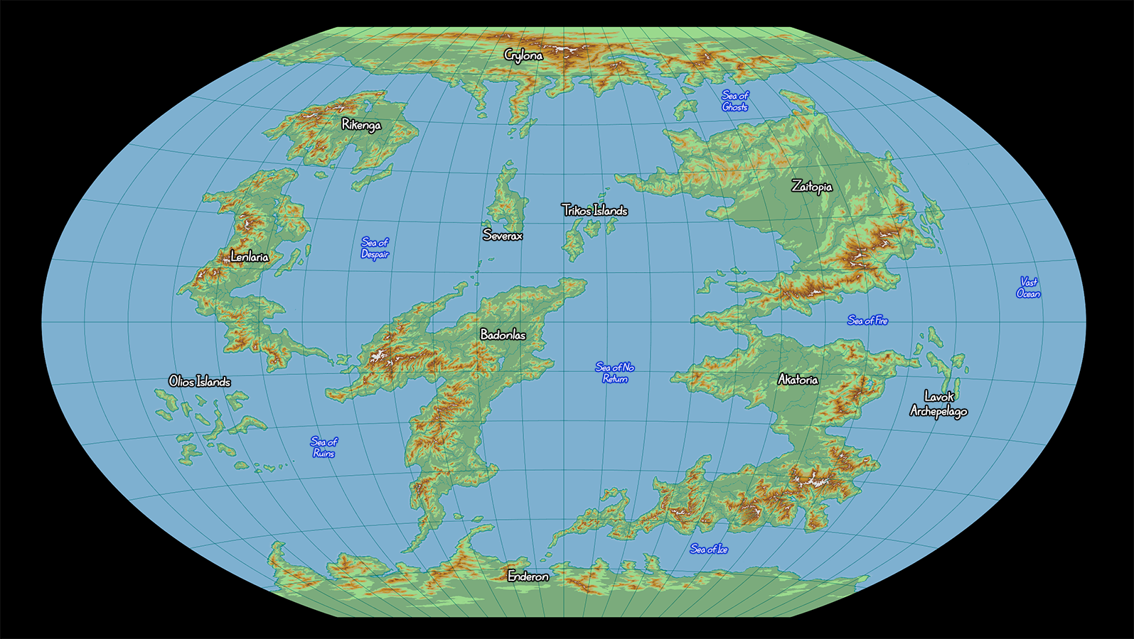 Formerly a province of Badonlas, the Olios Islands have since split off from their mother country, though they maintain a close relationship. These islands actually used to be a continent, but it was flooded when the global climate became hotter and the sea level rose. The waters between them are littered with the ruins of an extinct civilization who worshipped Kreatures as Gods, which have since become makeshift reefs for the aquatic Kreatures who live there.